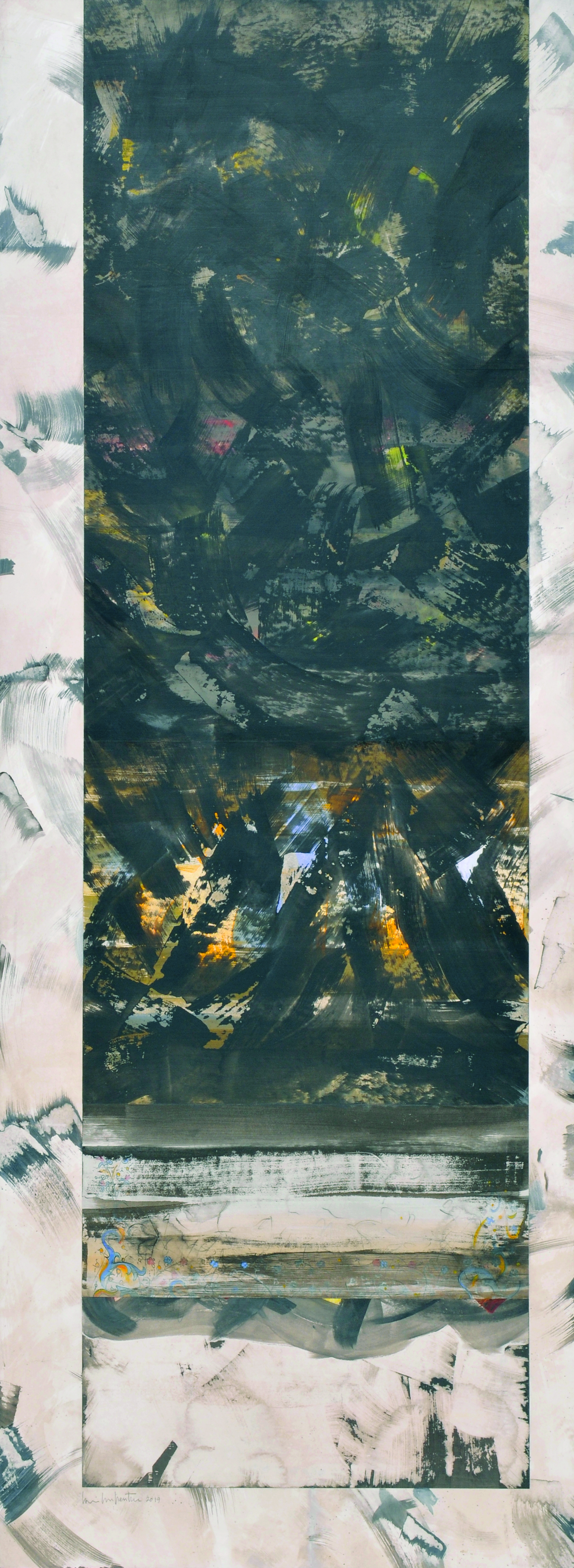 2019, graphite, acrylique et collage sur panneau de bois, 152,5 x 56 cm